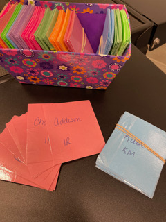 At the beginning of the school year I write each student’s name and class number on half of a 3×5 card. Then I laminate the cards and cut them in half. Once the cards are sorted, I rubber band the class all together and stick them in my little bin that sits right next to my chair at the front of the room. Whenever I need to choose students for an instrument or to answer a question, I use the cards. The students don’t ever worry about getting a turn, and I don’t have to worry about forgetting to call on students who don’t raise their hand.