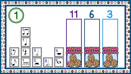 I made this slideshow as a Smart Board activity and Powerpoint. I wanted to give myself options to see which worked the best. I ended up using the Smart Board option. I dragged the note squares into the correct box or “cookie jar” so the correct number of beats was in each jar. There are about 20 slides with different number amounts. Every slide has the 3 numbers equaling 20, so all of the note squares are used for each problem. I could have continued in this way, going through each slide and having an individual student at the board, but that wouldn’t accomplish my goal of whole class engagement. I gave each student a baggie with the note squares and numbers. Some students would prefer to manually move the notes to figure out the problem, so I made the manipulatives for those types of students. After they put the note squares into the 3 piles, they drew the notes on a worksheet.